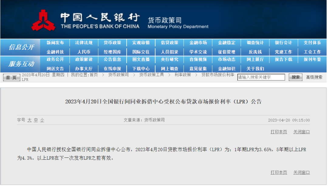 中国人民银行公布最新贷款市场报价利率(LPR)公布:4月20日贷款市场报价利率(LPR)为:1年期LPR为3.65%,5年期LPR为4.3%。